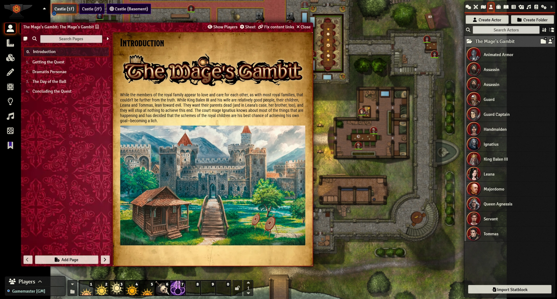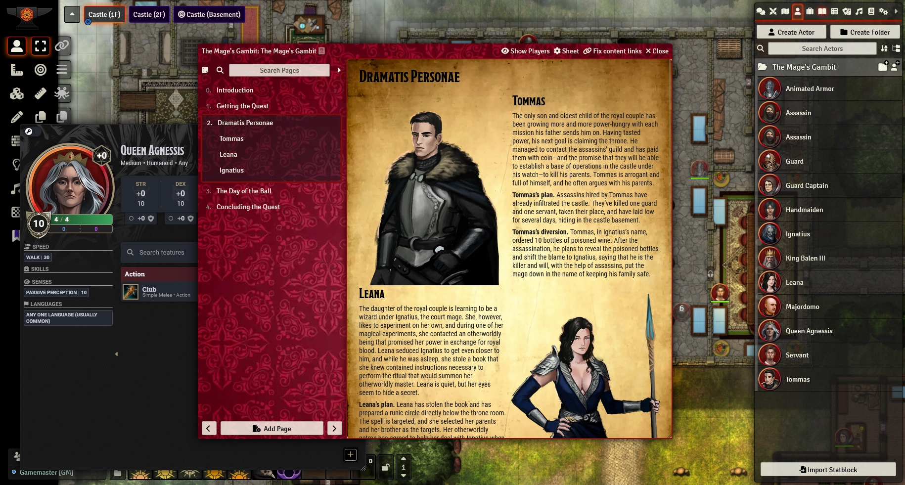 Mage's Gambit is time-sensitive adventure where adventurers have limited time to find leads and discover who wants the royal couple dead. The time is constantly ticking and heroes can only visit a finite amount of spots to investigate and meet suspects before the ball starts. Guide the players towards the truth or drop red herrings in their way, and let them reveal their findings before the ball - just before the plot comes to its conclusion!
