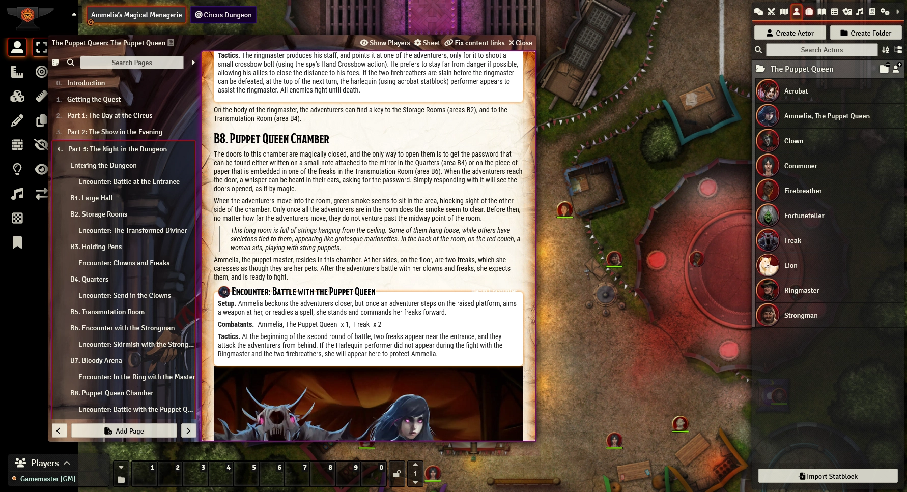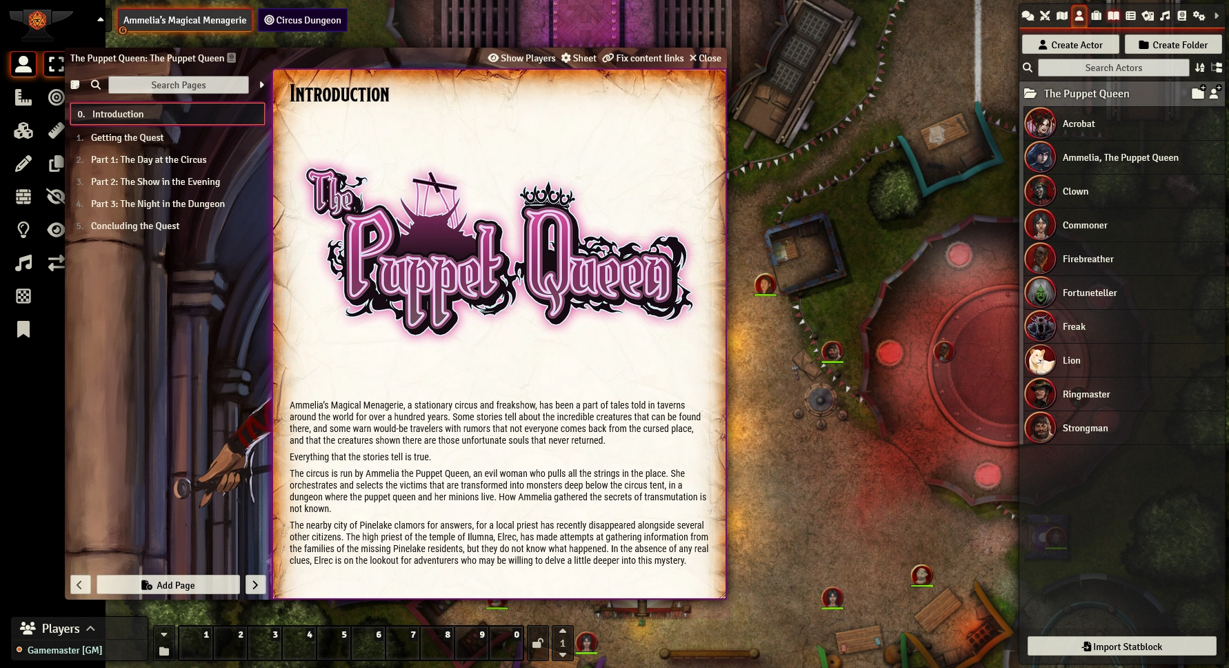 The Puppet Queen is a one-shot adventure for a party of 3rd-level characters (with scaling provided for running at level 5) where adventurers will discover the secrets of a centuries-old circus and its mysterious owner, Ammelia. Will you dare to look deeper into the circus's mysteries, even if it may cost you everything?